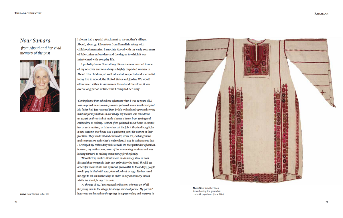 Threads of Identity is a history of Palestinian women told through aspects of popular heritage, focusing on traditional dresses but also including textiles and rug weaving, rural and urban customs, jewellery, cuisine, and festivities. The interviews with women who lived through the traumas and changes of the 20th century are a contribution to oral history, augmenting standard historical accounts. While most writing about the Middle East concentrates on politics, her book focuses on the dignity of ordinary people, and women in particular, bridging the gap between the major events of history and everyday life.