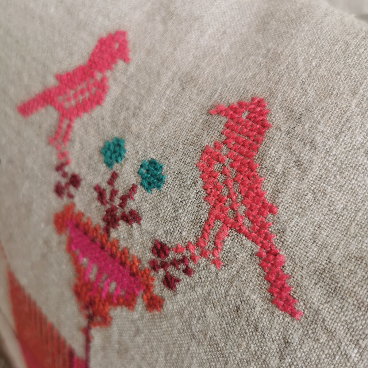 Discover the "Two Birds in a Garden" square cushion, a beautiful piece that carries the rich heritage of Palestinian embroidery. Inspired by the traditional motifs found on women's clothing, this design by Grace Abdo is brought to life through the skilled hands of the "Women in Hebron" cooperative, exclusively for el Bustan.